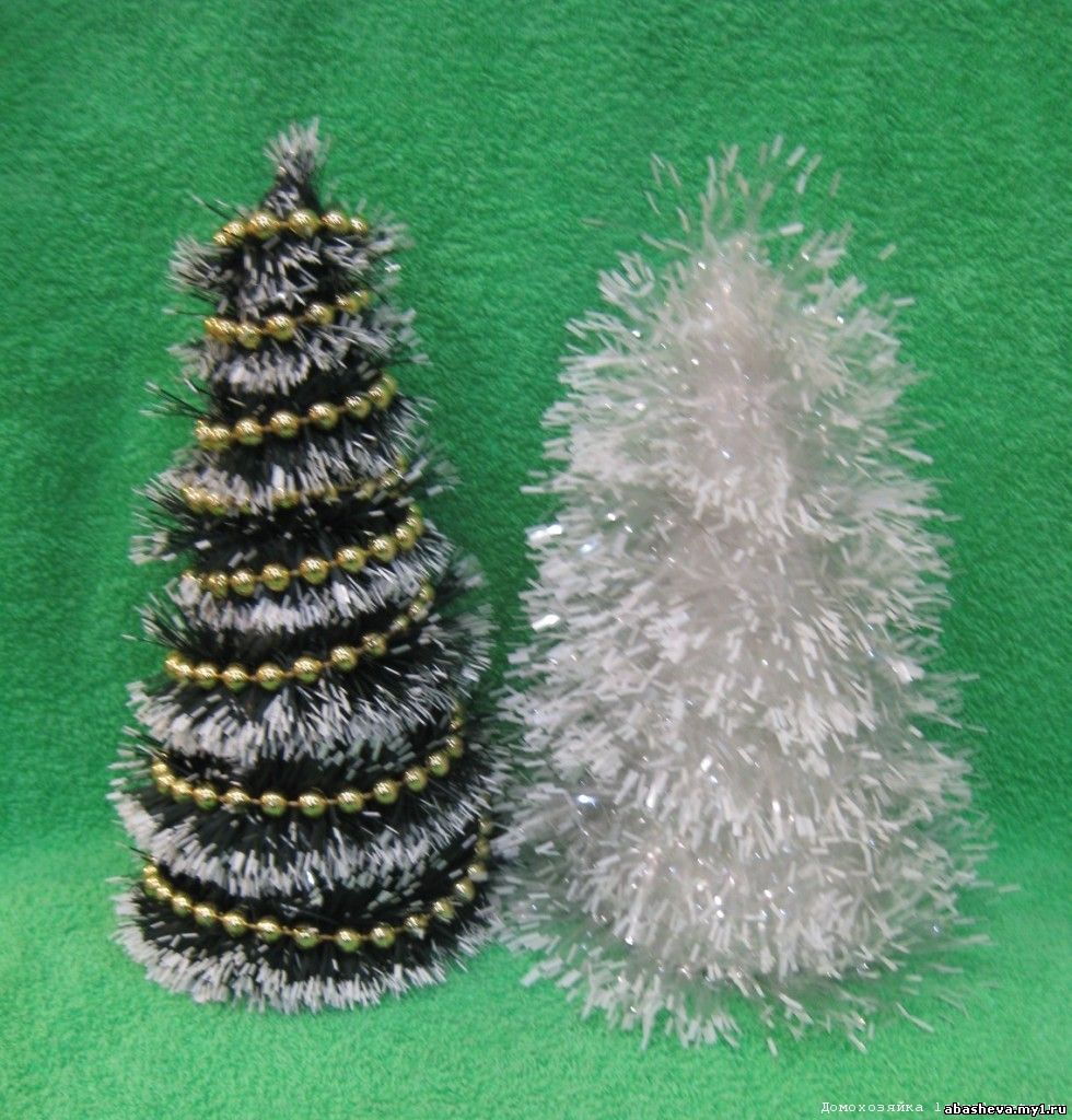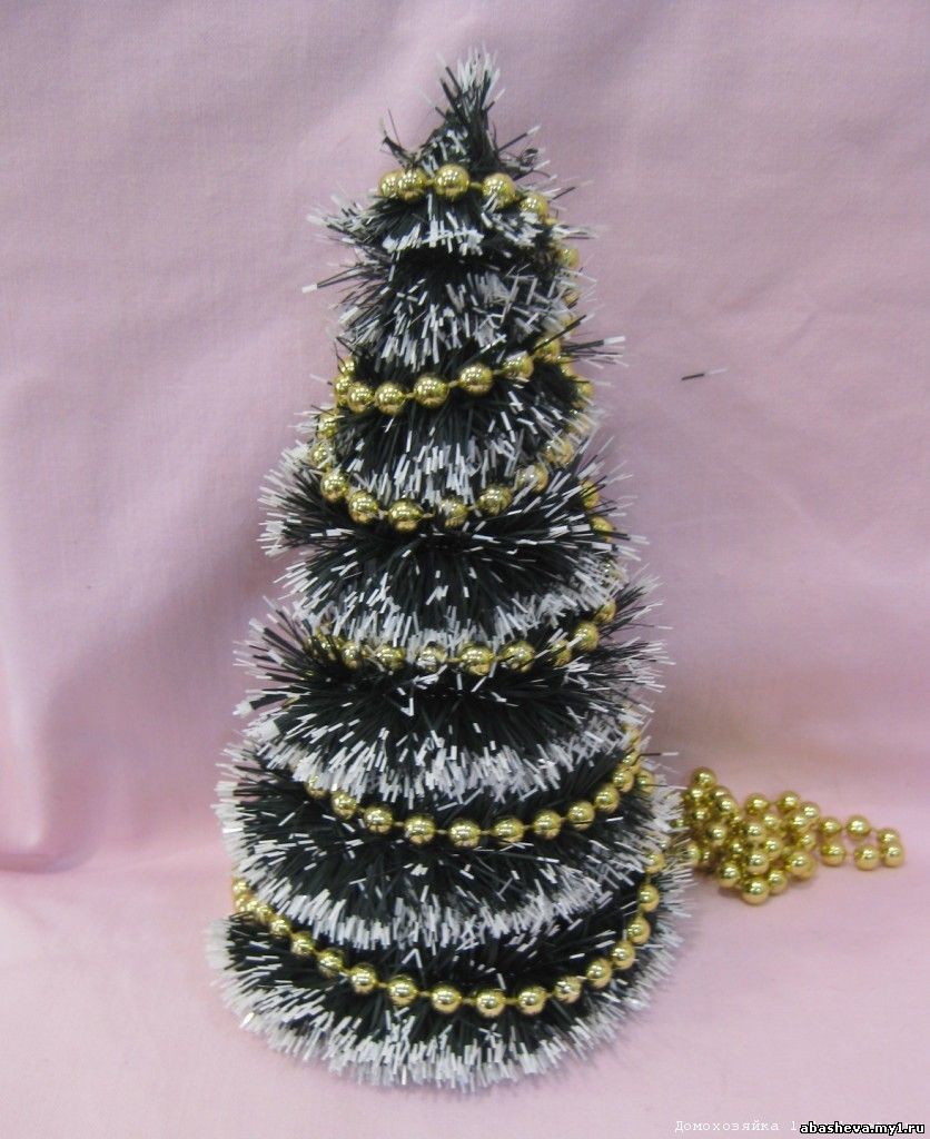 При желании можно украсить готовую елочку мелкими бусами. Также намотать их поверх мишуры.