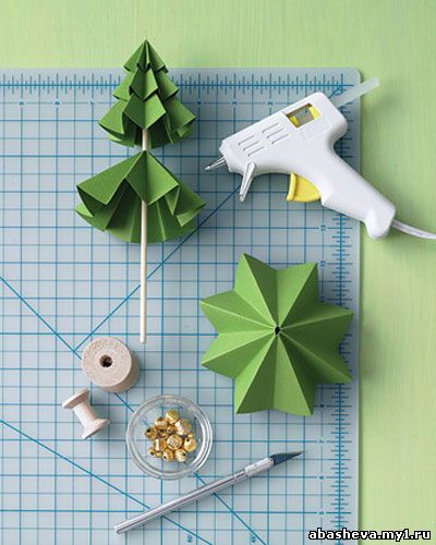 3. Возьмите деревянный стержень. Маленький сложенный круг наденьте на кончик деревянного стержня так, чтобы стержень вылез из отверстия на пол сантиметра. Затем, через низ деревянного стержня «наденьте» остальные круги. Отверстие в макушке самого большого круга смажьте клеем и приклейте к деревянному шпику. Подержите минут 10. 4. Деревянный стержень с нашей готовой елочкой вставьте в основание, можно например в пробку из-под вина. На макушку елки, где мы оставляли зазор шпика в пол сантиметра, наденьте бусинку любого цвета.